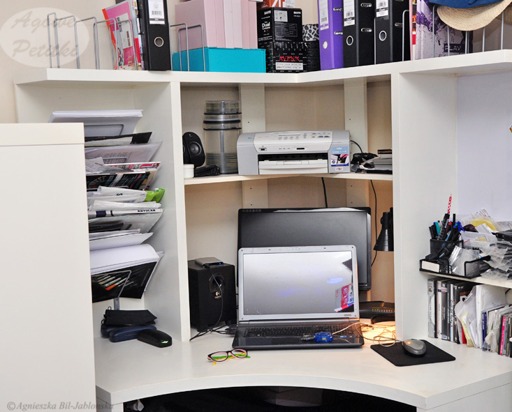 I ostatnia przemiana na dzisiaj- stolik komputerowy. W oryginale biało-czarny. I tu mamy bałagan i wielki misz-masz.
